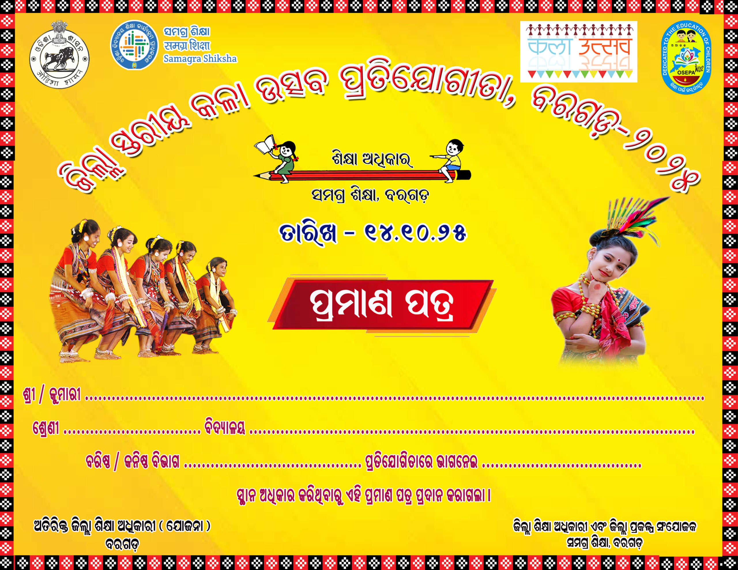 ଜିଲ୍ଲା ସ୍ତରୀୟ କଳା ଉତ୍ସବ ପ୍ରତିଯୋଗୀତା ପ୍ରମାଣପତ୍ର